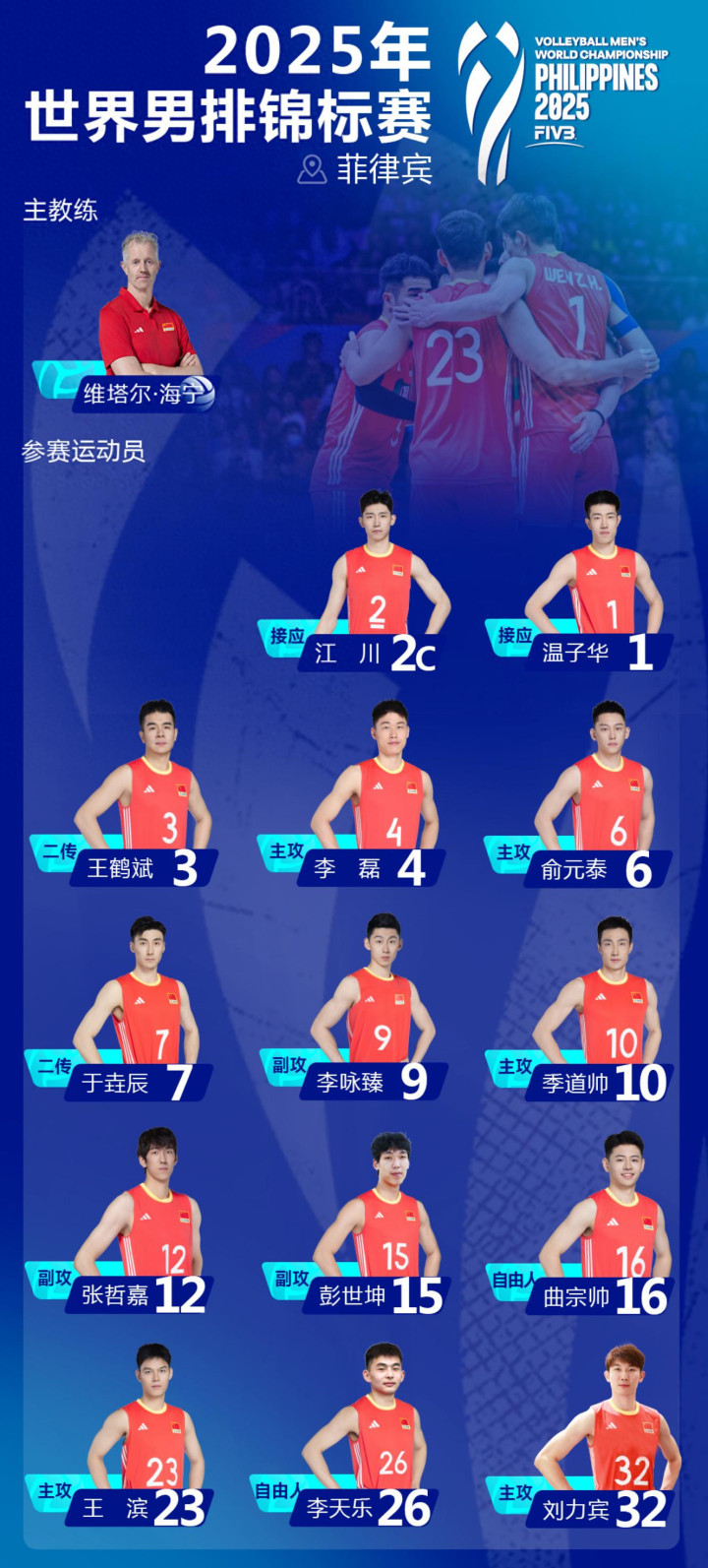 从中国队的14人名单来看,主攻位置:李磊、俞元泰、季道帅、王滨、刘力宾;在副攻位置,李咏臻、张哲嘉、彭世坤;江川和温子华担任接应,王鹤斌、于垚辰担任二传,曲宗帅、李天乐则是自由人。