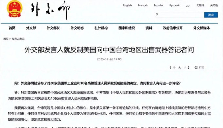 2025年12月26日,中国政府对美国军售台湾一事做出了一个深刻的象征性的反制举动,决定制裁20家美国军工企业和10名高管,此事距离美国批准对台军售只有8天,其猛烈程度令外界感受到中方捍卫主权核心利益的决心线上股票配资专业,也使得台海局势更加紧张。